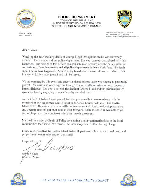 In an open letter to the community on Thursday, Shelter Island Chief of Police James J. Read shared his thoughts about the death of George Floyd at the hands of Minneapolis police officers and the ensuing protests: