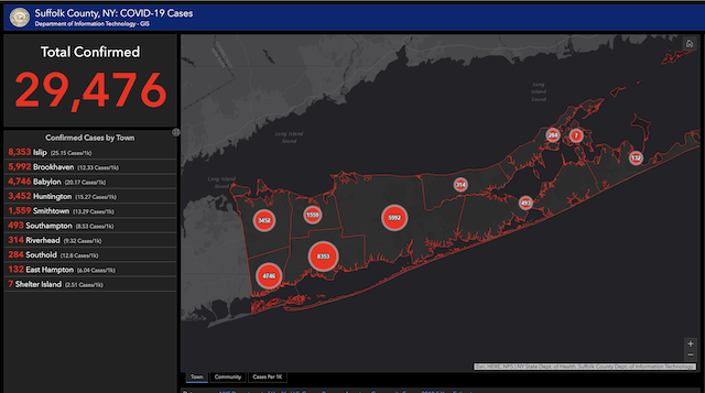 Suffolk County reported 29,476 confirmed COVID-19 cases Wednesday. The number of confirmed cases on Shelter Island remained at seven, but local officials say they know of eight cases.
