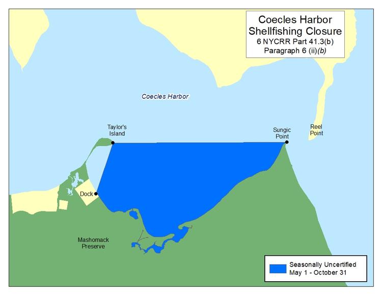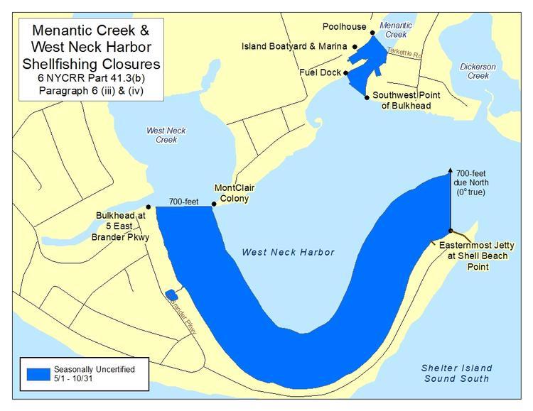 The areas in question are the inside of Shell Beach in West Neck Harbor and a large area of Coecles Harbor between Sungic Point and Taylor’s Island.